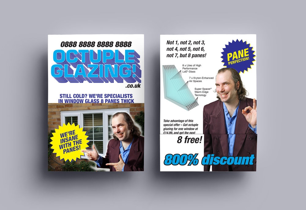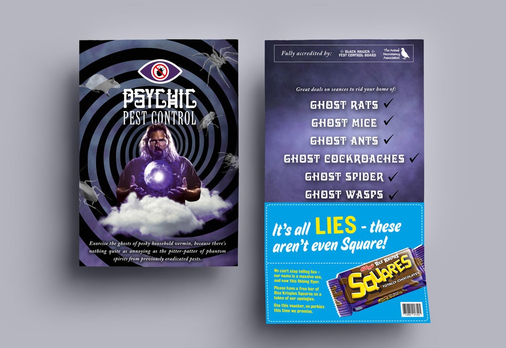 These very nearly got out the door as a cheeky direct mail idea for Rice Krispies Squares. Building on the It's All Lies campaign, we created a series of door drop flyers for totally absurdly fake local services, with a fold out voucher for a free bar.