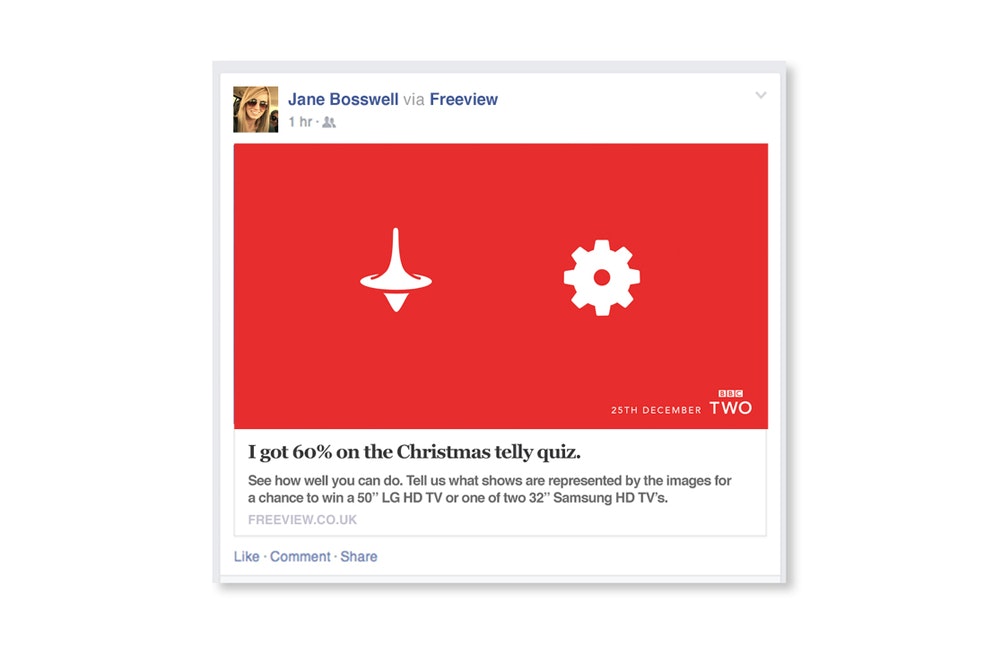 With Freeview, especially over Christmas, you get to watch the nations favourite TV shows for free regardless of what channel they're on. This was a spec idea that showcased all of our best-loved shows as a series of simple cryptic pictograms. They ran as outdoor posters in the lead up to Christmas as well as an interactive game on social channels.